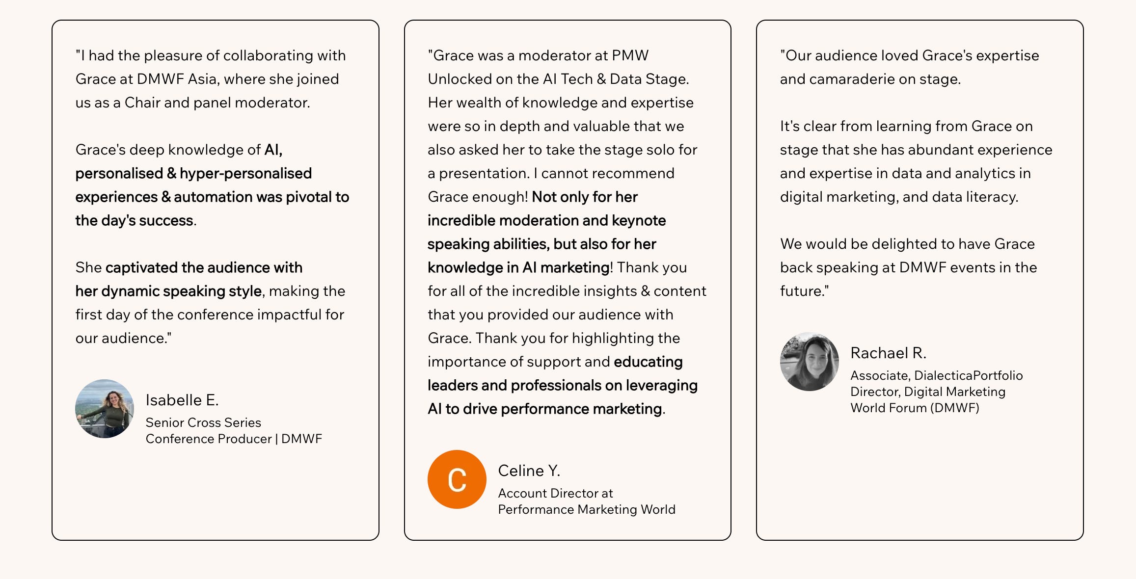 Interested in collaborating with Grace, whether for a podcast, interview, newsletter feature, workshop, event, or future strategic partnership?